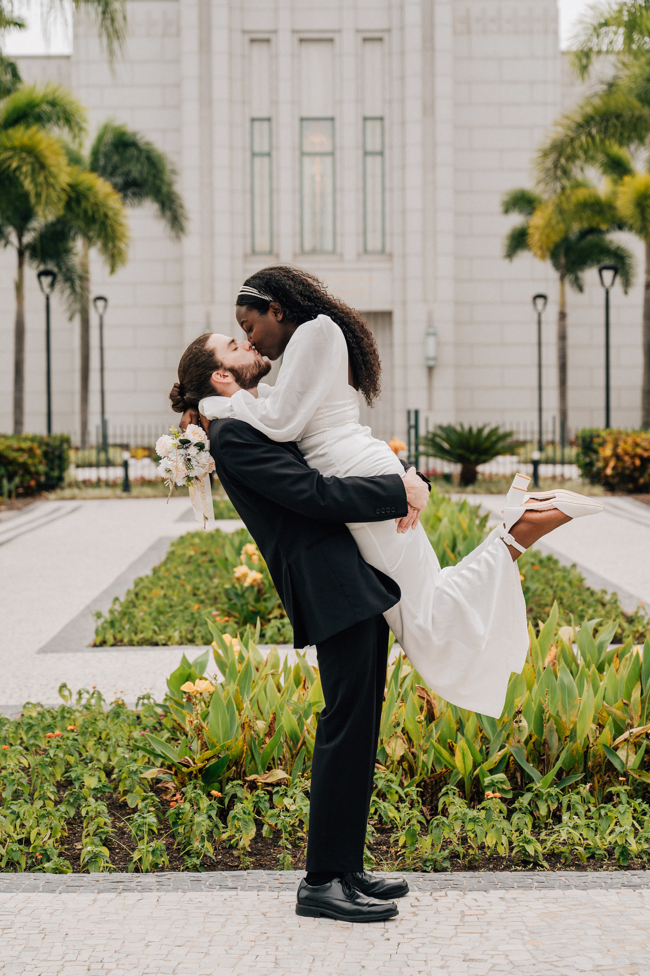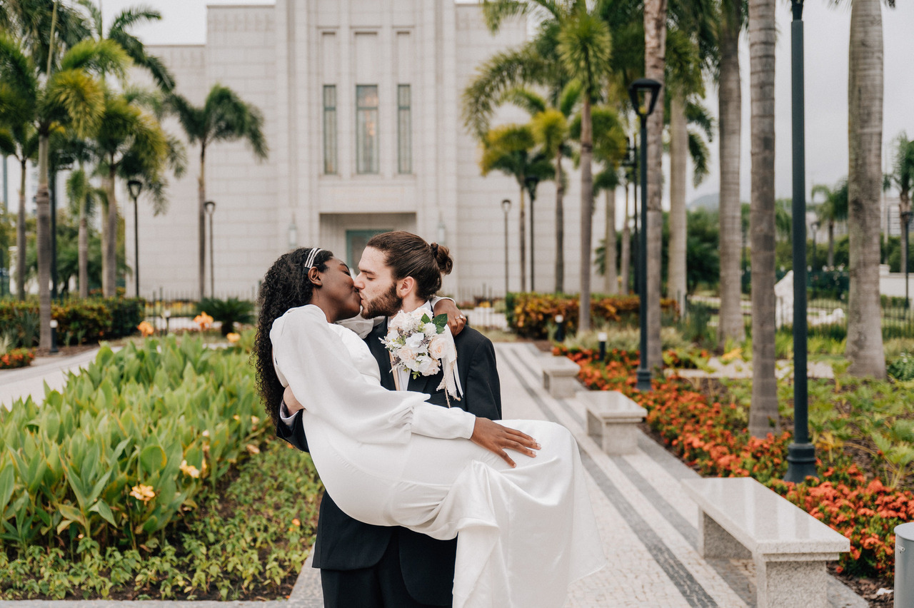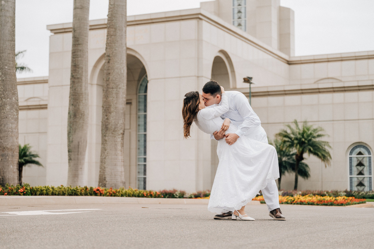 Se vocês querem se aventurar um pouco mais podem optar pelo "beijo nas alturas" onde o noivo, envolve seus braços abaixo da cintura da noiva para levantá-la e assim poder beijá-la. Noiva, seus pés podem trazer um charme a mais para a foto, você pode optar por deixá-los na mesma altura ou, um dos pés pode ficar mais baixo que o outro, trazendo mais naturalidade para a pose.