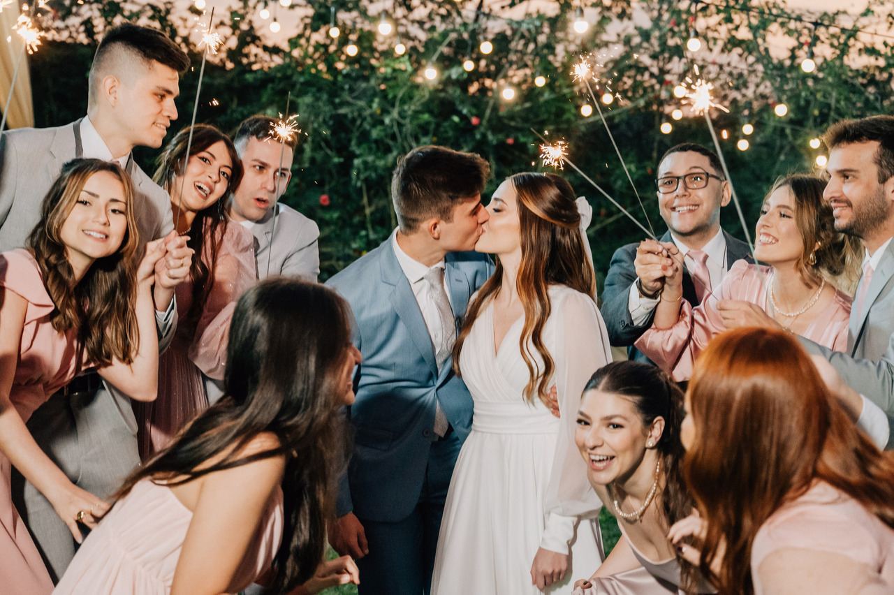 Essa pose é a marca oficial de que agora vocês estão casados e muito felizes, permita que os demais apareçam na foto ao formar um corredor, comemorando enquanto vocês se beijam pelo caminho.